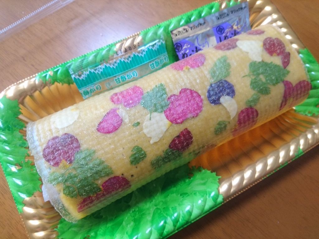 海苔の上から玉子を巻き、その上に色とりどりの食用花を飾り、上から透明の食べられるシートを巻いています。