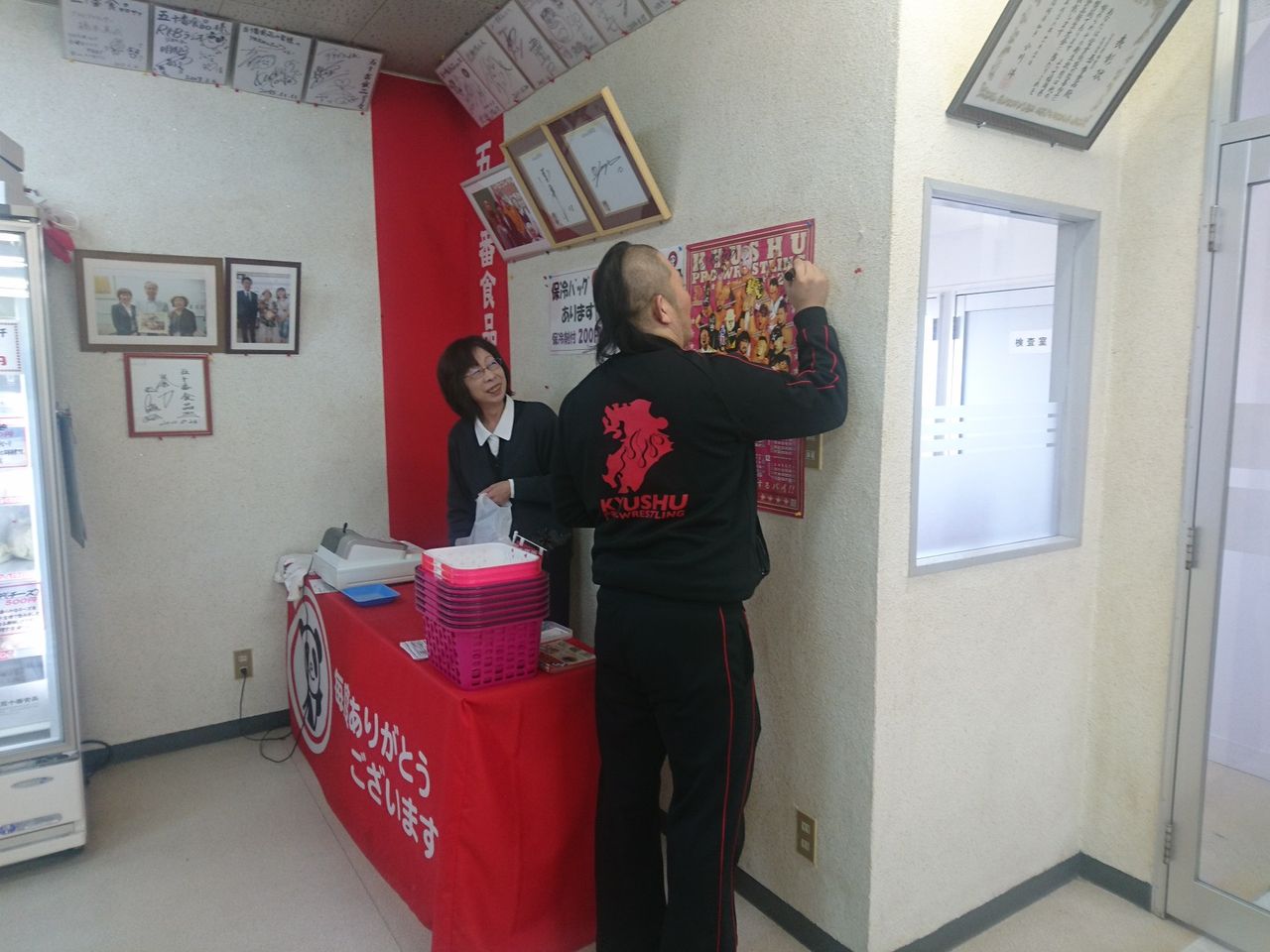 ↑ 直売所に貼ってある九州プロレスのポスターにサインをしてくださいました