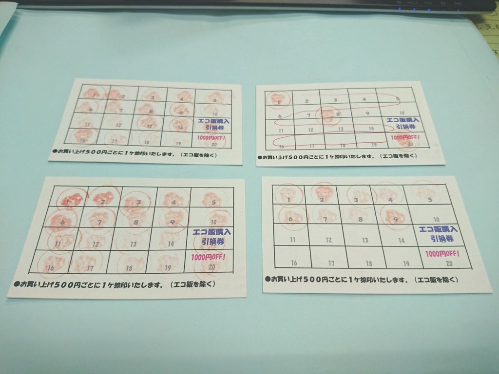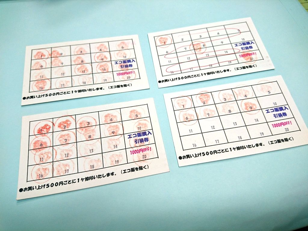 お買い上げ500円ごとに1ヶ捺印し、20ヶ貯まれば1000円の割引券として使えます